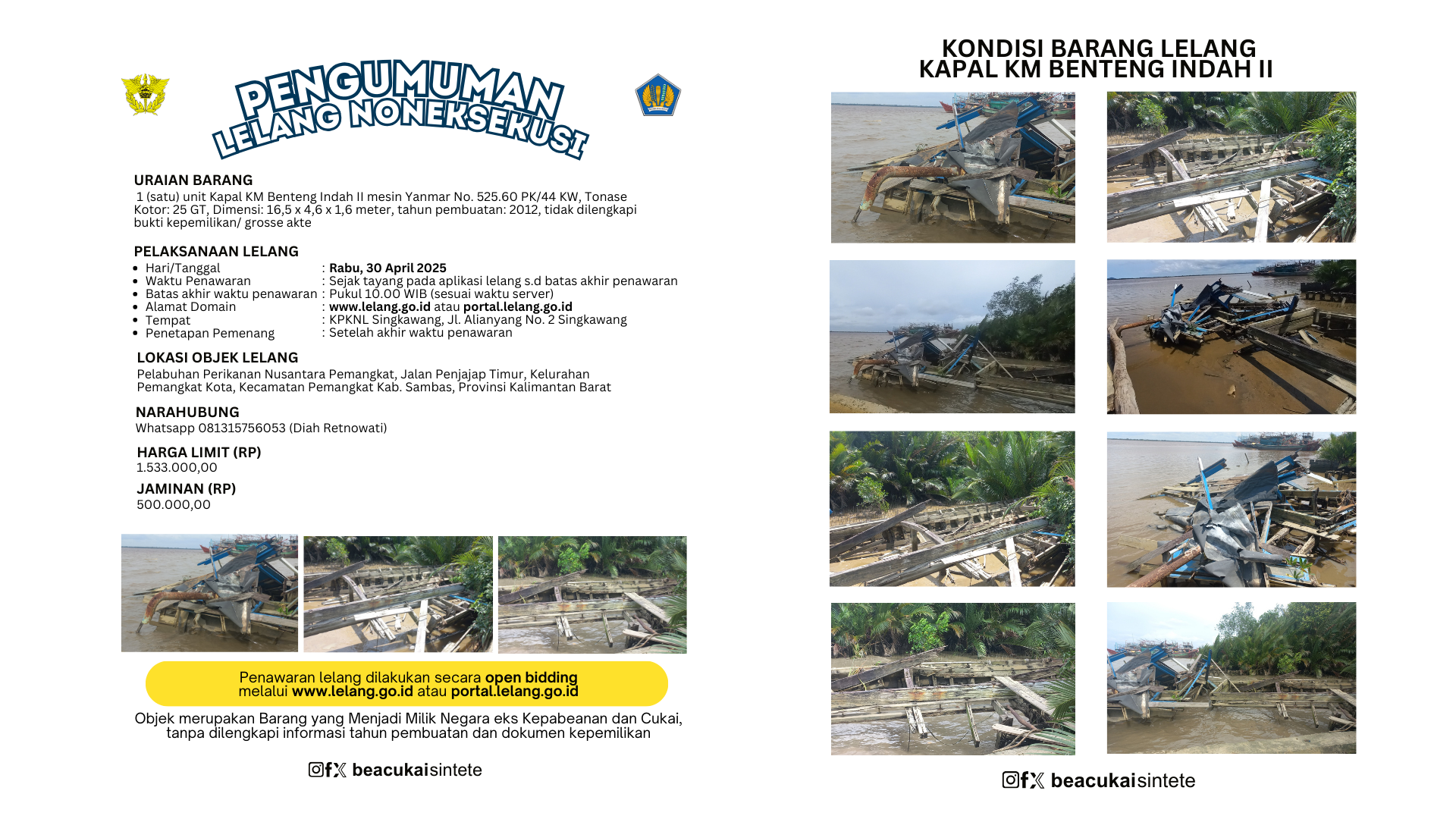 Bea Cukai Sintete melalui Kantor Pelayanan Kekayaan Negara dan Lelang (KPKNL) Singkawang, akan melaksanakan Lelang Noneksekusi Barang Milik Negara berupa 1 (satu) unit Kapal KM Benteng Indah II mesin Yanmar.
